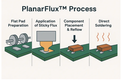 The PlanarFlux™ Process is an advanced surface mount assembly technique designed to eliminate solder paste by combining precision-flattened solder pads with a high-tack flux application. Developed to improve process reliability and reduce common defects like tombstoning and voiding, PlanarFlux™ enables consistent component seating and strong solder joints by leveraging the existing HASL finish. Components are placed directly onto the tacky flux-coated pads and reflowed, forming robust metallurgical bonds without the variability of paste printing. Ideal for high-mix, prototype, and low-volume production, the PlanarFlux™ Process streamlines assembly while enhancing precision and repeatability.
